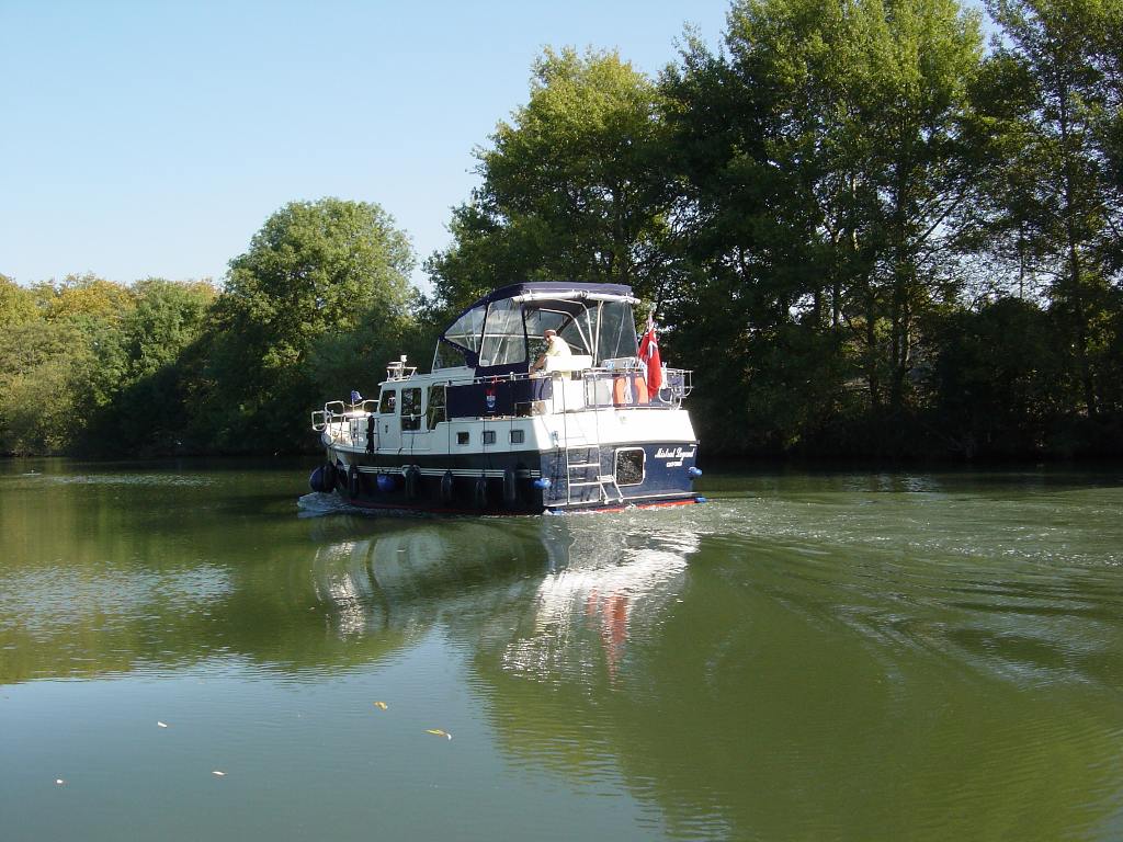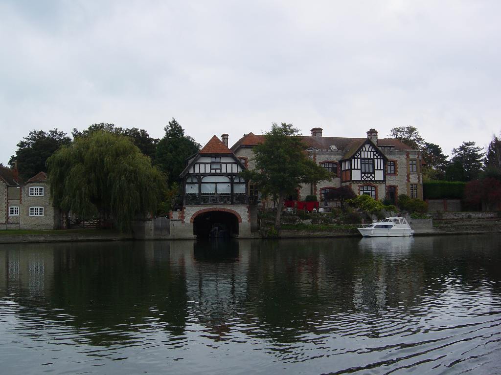 Saturday 6th October 2007 Location: Wallingford, Oxfordshire, Thames Today: 17 miles, 5 locks. Total distance: 694 miles. Total locks: 471 Cool and grey all day. Reasonable t-mobile 3g reception here Pulled the pins around 09:00 and headed on down the Thames. Some lovely scenery on the way. After passing Abington, we both decided that we fancied roast beef for dinner as it was a cool and grey day. Talking to the lock keepers on the way, we were advised that the closest place to find a joint of beef was Wallingford so that is where we headed for. Arrived Wallingford mid afternoon. There were no suitable moorings below the bridge even though the guide books indicated that there were some. Turned around and headed back up the river and managed to find a length of bank with water deep enough to get in close enough to moor. Walked back into Wallingford to the Waitrose supermarket where Rhonda bought a lovely lump of rib of beef on the bone. Cooked a full roast dinner in the evening and it was lovely. We arrived at Benson Lock at 13:40 and found a note from the lock keeper informing us that he would be back from lunch around 14:10. The lock keepers usually go off for lunch between 13:00 and 14:00. Decided that we would have a go at operating the lock ourselves. All of the locks that we have passed through since Oxford have been hydraulically operated. When the lock keepers go off duty, they turn off the hydraulic pump so the lock has to be operated by turning a large wheel that operates a hydraulic pump. We managed to get through the lock but in future will wait for the lock keeper to return as operating the hydraulic pump manually is VERY hard work!! Set up the satellite dish in order to watch the dancing program on BBC1 at 18:15. Managed to get all channels accept BBC1. The BBC1 channel was there but badly broken up. The last time I set up the dish for the TV was last Monday and BBC1 was breaking up then as well. I had put the poor signal down to weather but it looks as if there is some other reason. I checked on the web and found some info that suggested that the signal strength should be around 80% and the signal quality should be over 50%. Ever since buying the dish and the Sky box, I have never seen the signal quality better than around 15% although the signal strength is always up around 80%. Will have to investigate further as it looks like there has always been a problem and it has now got to the stage where the signal is just not good enough for BBC reception. Current mooring - early Sunday morning Abington Big plastic Just south of Abington, the canal is now a road!! Nice little house on the bank of the Thames. Would think about buying it if the boat house was big enough to take a narrow boat!! Previous Page -- Next page -|- Index page |