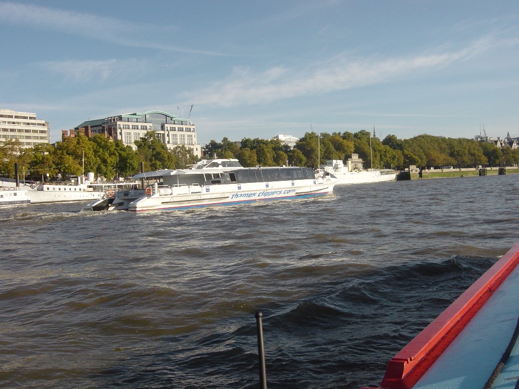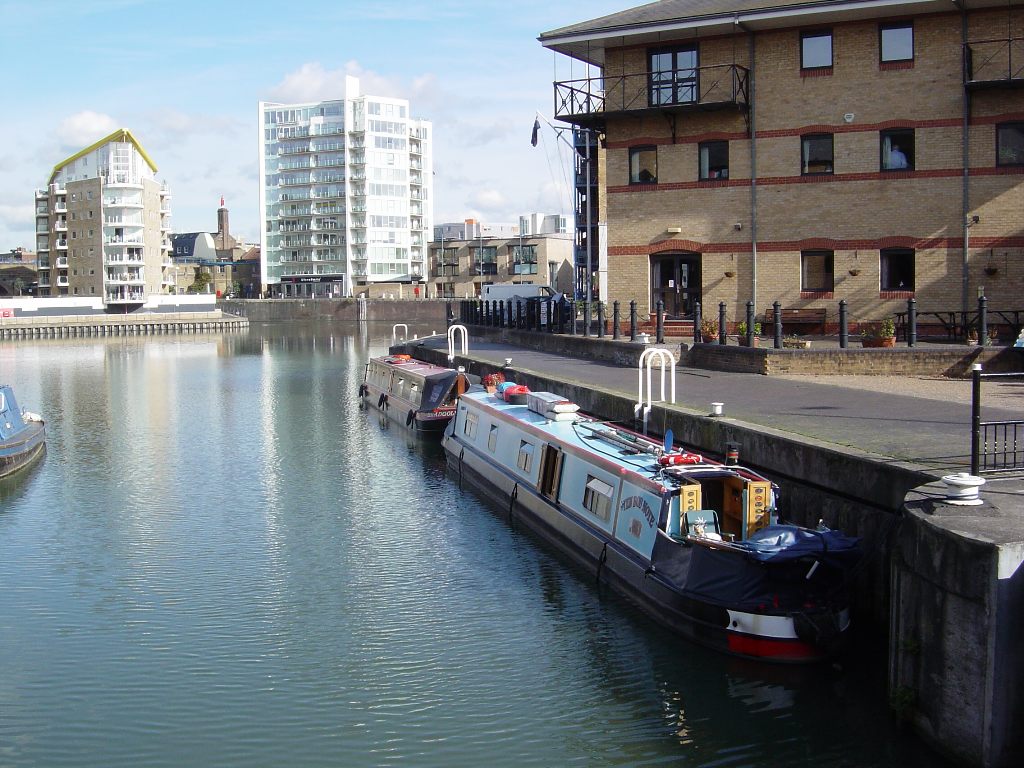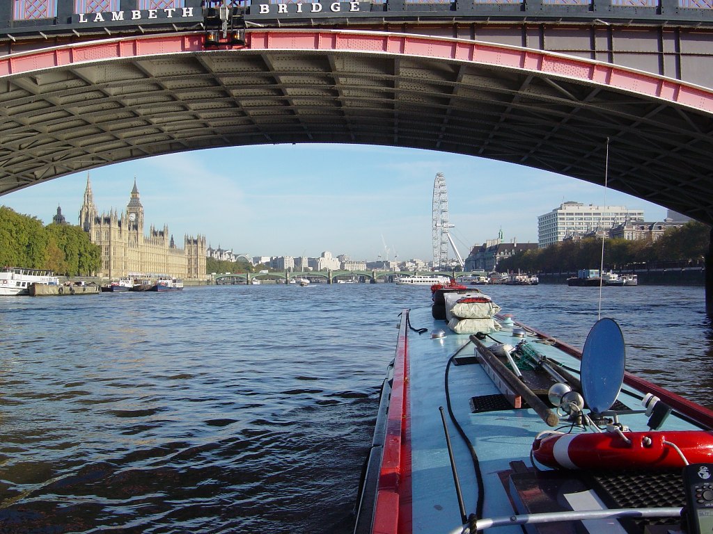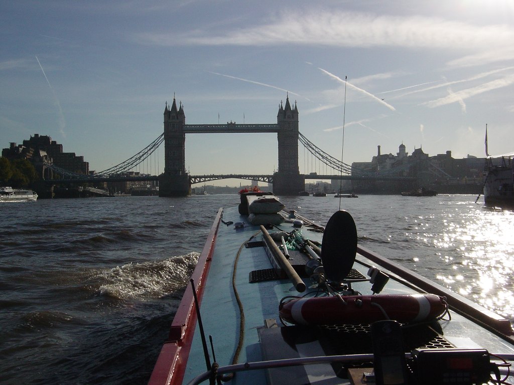 Thursday 18th October 2007 Location: Limehouse, London, Thames Today: 22 miles, 2 locks. Total distance: 804 miles. Total locks: 507 Lovely bright day after early mist cleared. Good t-mobile 3g reception here. Total trip time from Teddington to Limehouse was three and a half hours. The alarm went off at 06:00 so that we would be ready to catch the tide at 07:00. Was a cold morning, 1 degree C when we set off. Dropped down through Teddington lock at just after 07:00. Very misty but could see well enough to proceed with care. A short distance down river we came across rowers hiding in the mist – they must be mad as they have no lights and they are so low in the water that they are very hard to spot. Lucky we didn’t run over any of them. As we neared central London a fairly large private boat coming up stream fast decided to move across the river so that he could pass us at close quarters. The wash from their boat (there were two youngish male occupants) caused us to rock n roll quite severely. A short while later we heard London VTS call them up on the radio and advise them that there had been complaints about the amount of wash that they were creating and about their disregard to workmen on a pontoon near by. Twenty minutes later the same boat passed us again on it’s way back down river. It could have given us a wide berth but instead decided to come close to give us another ride on their wash. This time I reported them to London VTS and listened in as London VTS advised them that two reports of poor behaviour in one morning was not a good record. We saw them a bit later going somewhat slower so the message must have sunk in. Once we got close to Westminster we started to meet up with the trip boats – they are notorious for creating large amounts of wash. I think we hit them all starting their working day at around the same time as they were everywhere. At one point we had a trip boat passing us on each side. The idea is to turn the bow into their was but when they are attacking you from both side you have nowhere to hide. All in all, it made for a very interesting ride for the last few miles of the journey. Felt much better by having the life jackets on. Called Limehouse lock on the VHF as advised to do so on passing under Tower Bridge. Limehouse informed us that they would open the gates in readiness for our imminent arrival. Previous advise was for us to carry on down stream past the entrance to Limehouse then turn across the river and approach the entrance coming up stream. Just as we were getting close to the entrance while still heading downstream, the lock keeper called us up on the radio and suggested that we should just cross the river and head straight into the lock as there was no other traffic about. I took the advise and turned across the flow. At this time, the flow of the ebbing tide was still quite strong and was pulling us fairly hard down stream. I had the boat on full power and heading for the brick wall just up stream of the lock entrance hoping that the flow of the current would pull us down stream with the right timing for us to meet the entrance of the lock – all in all, a bit hairy!!. It worked and we entered the lock channel without hitting anything but I am not sure that Rhonda would like to repeat the manoeuvre again any time soon. It would have been easier if I had been intending to enter the lock from an up stream position and had started to cross the river earlier with more time to judge the effect of the tide. GPS track here We asked the Limehouse lock keeper about mooring for the night and he suggested we moor right beside the top lock gates as there have been problems with kids untying boats and steal things like bicycles off the roof. He also advised not mooring anywhere this side if Little Venice. We decided to moor beside the top gate as he advised and to chain the boat to the wharf so that if kids cut the ropes we aren’t going to go anywhere. We will set off tomorrow and probably make a run for it all the way to Paddington basin where we believe there are some good safe moorings. After mooring up we walked with the dogs to the Canary Wharf building to visit the Waitrose store to pick up a fresh chicken to BBY tonight. Canary Wharf is about a 30 minutes walk from Limehouse basin – well, it was 30 minutes by the route we took, someone in the basin told us it was only ten minutes walk away. The Canary Wharf building brought back memories as I was working and staying in Greenwich when they were building it and I watched them putting the roof on from my rented room window. All in all, a very interesting and fun day and the weather couldn’t have been better for it. Next time, we will try and time it so that we miss the trip boats. Current mooring Battersea