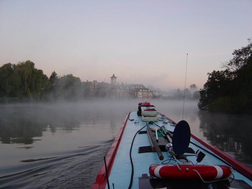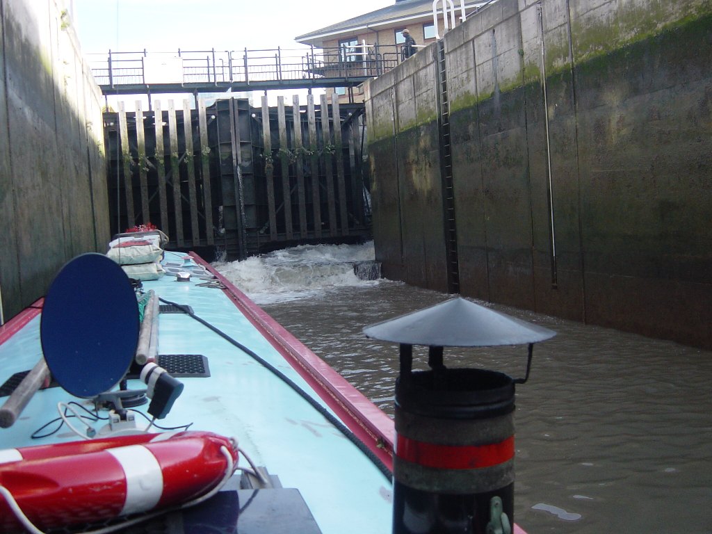 Limehouse lock fills by opening the gates slightly Early morning mists - rowers hide within The photo doesn't show it well but the wash is about 18" high Trip boat coming up and one pulling out across our bow Previous Page -- Next page -|- Index page |