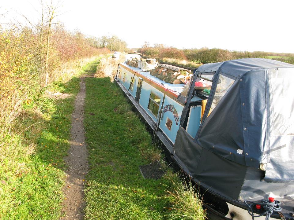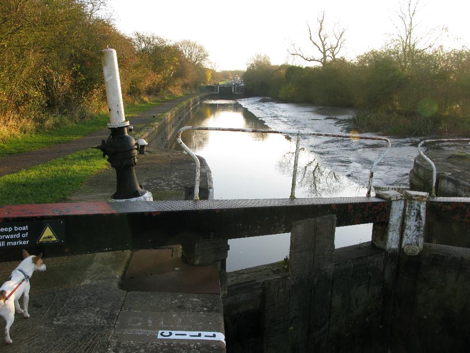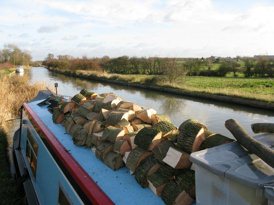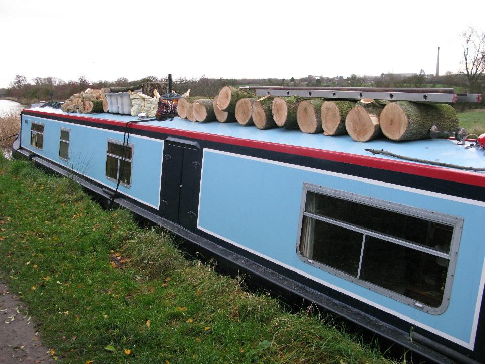 Wednesday 19th November 2008 Location: Long Itchington, Grand Union Canal Today: 2 miles, 5 locks. Total distance: 1872 miles. Total locks: 1291 Up early as it was such a lovely morning and I was wanting to move on to Long Itchington to visit the Co-Op to buy some bread. Pulled the pins just before 08:00 and headed up through the locks. I arrived at Bascote Bottom lock to find the pound almost drained (a pound is the name given to the stretch of water between two locks). Someone had left one of the paddles slightly up and the water had drained out over night. It took the best part of an hour to re-fill the pound by opening the paddles on the three locks above the drained pound. Good exercise first thing in the morning!! I passed nb Joie de Vive (good name) half way through the locks. I have seen Joie de Vive around Braunston quite a few times in the past. The lady owner (she is travelling single handed too) told me she had a winter mooring in Braunston last year so that is why I have seen it around so often. A BW van pulled up just as I was mooring up to shut the gate on the top lock. The lady driver got out and kindly shut the gate for me. I found the slogan on the side of her van very apt after all of my running about to re-fill the pound this morning – it refers to the waterways as ‘an open air gym’, I can certainly vouch for that!! After mooring up, I took the dogs for a two mile round trip walk to the Co-Op in the village to pick up a loaf of bread – I think that will do me for exercise for today….. Friday 21st While chopping up the wood, I was pondering just how much energy has gone into it all. Firstly finding the tree, cutting it into manageable lengths, carrying it to the boat and lifting it up on to the roof, lifting it off the roof again, cutting it into rings, splitting the rings with a big axe, lifting the logs back onto the roof then finally, lifting the logs back off the roof to burn them……Must be a few calories burnt in that lot!! I had to move a lot of the wood to the rear of the boat yesterday morning as with all of the weight being up front, the drain holes for the gas locker were a couple of inches under the water – not good. I have distributed all of the logs so that with a full tank of water (it’s full at the moment), the gas locker drain holes are a few inches above the water line. Current Mooring
