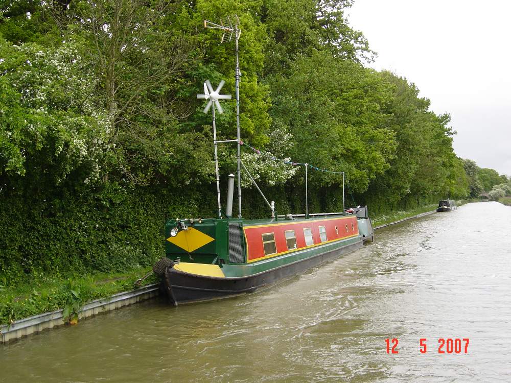 13th May 2007. Today is my daughter Tracy's birthday and also my niece's son Luke. Happy birthday. Well, we moved on to the boat last Thursday as planned and left Ventnor farm for the last time. We had a very pleasant year at Ventnor and will miss the friendly and helpful staff there. I am now into my sixth week of retirement and must say that I don’t know how I ever had the time to work!! I can thoroughly recommend this retirement lark, my advice to anyone would be to retire at the earliest possible opportunity and enjoy life while still fit enough to do so. Anyway, we spent a couple of nights in Braunston as we are very fond of the place. We also needed the time to try and sort out all of our belongings that we brought with us (Rhonda is still looking for places to stow stuff as I write this). Everything will be found a place to live – eventually. Left Braunston yesterday morning and came up through the Braunston locks with a party of Australians on a Calcutt hire boat. This was their first time on the canals and they were enjoying it. We showed them how to work the locks and pointed them at the Admiral Nelson for lunch. We arrived at the Watford flight mid afternoon and managed to get up through the locks in less than an hour as traffic was light. On the journey between the Watdford flight and the Crick tunnel, we passed an interesting boat with modifications for carrying a motor bike. As an ex-biker, this interested me greatly. We arrived at Crick late afternoon and moored up about half a mile or so north of the marina. We are booked in to have the hull blacked on Wednesday and the weather forecast for today and tomorrow was not looking good so we made the trip yesterday while the weather was good. I am glad that we did as it has been raining all morning. The signs are up along the tow path close to the marina informing that the moorings are not to be used as of yesterday due to the Crick show at the end of the month. It didn't bother us as we like to moor out in the quieter areas so that the dogs don't get wound up too much by passers by. We have just finishe a wash in the Hoover WDM-120 Washer/Dryer that came with the boat. It has washed the clothes well but the tumble dryer is a bit of a dissapointment. After 40 minutes tumbling a fairly small load of washing, the clothes are still quite wet. I never have been a fan of Washer/Dryer combos, I had on 15 years ago and it was also not that great at drying. The clothes are now on a clothes horse in front of the diesel Bubble stove. The stove is on, not because it is very cold, it's on because the weather outside is wet and miserable and the boat is much nicer with the fire lit. The washing should be dry in no time. Previous page -|- Next page -|- Index page |