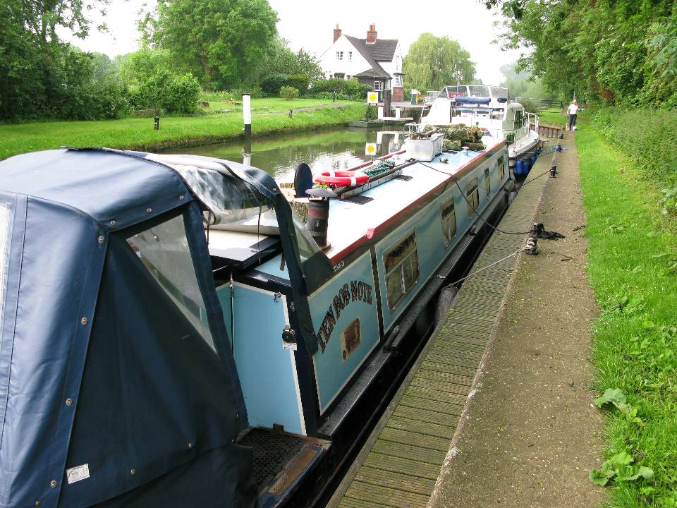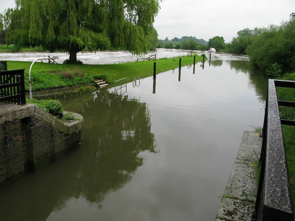 Wednesday 28th May 2008 Location: Benson, Oxfordshire, River Thames Today: 21 miles, 8 locks. Total distance: 1393 miles. Total locks: 964 Up at 05:30 today and pulled the pins at 06:30. We wanted to get as far up the Thames as we can today so that tomorrow will be less of a rush to get to Oxford and off the river. Got down to County lock and had a good look at the river conditions before proceeding. The entrance to County lock is right beside a weir and with the strong flow a bit of care is required. By the time you get there, there is no turning back as there is nowhere to turn. Decided that the flow on the down stream side of the weir was manageable so went for it. There were a couple of folk (yes even at that time of the morning) that decided to hang around and watch us exit the lock – fortunately we gave them nothing of great interest to see. We flew down through Reading town centre and arrived at Blakes lock in double quick time. Dropped down through Blakes lock and were happy to be on the Thames after the fast flowing Kennet. Stopped off at the Reading Tesco as there was one space left on their 24 hour mooring. Picked up a bit of shopping then headed off up stream. Progress was much better than expected as the GPS indicated that we were making almost 4MPH against the flow (almost full throttle – 2000 revs). Bought a one day license from the staff at Caversham lock (first lock you hit up stream of the K&A). The one day license expires at midnight tomorrow so that gives us all day today and all day tomorrow to get to Oxford – should be no problem with two 10 hour days. Chatted to the lock keepers about the river flow rate and they thought that although the yellow ‘Strong Stream’ boards were up, the flow should not get any worse and the journey up to Oxford shouldn’t be a problem. Before I forget (dementia setting in ??) we bought diesel at Reading Marine yesterday at 71 pence per litre which is a very good prices at the moment. Headed on up the Thames and as we progressed, the GPS indicated that we were getting slower and slower as the miles passed by. Just below Wallingford the rain came on and turned a bit on the heavy side. Passing under the centre arch (the widest arch) of Wallingford bridge was a bit of a struggle – on full power (2200 revs), we were only just moving forward!! Approaching the next lock after Wallingford (Benson) was also interesting due to the strong side flow from the weir there. Into Benson lock and we were given the news that we had not been wanting to hear – but had been expecting with the increasing flow – the next lock up stream, Day’s Lock has red boards up and the advice is to moor up until the conditions improve. After a quick chat with the Benson lock keeper, I decided to turn around and head back down to Wallingford and moor up in the trees and sit it out there until the levels drop – there are some good shops at Wallingford but not much at Benson. He agreed that there were much better facilities back at Wallingford and that it was probably a good option. I headed off a few hundred yards up stream (well away from the weir) and turned around so that we were pointing back towards Wallingford. Got back to the lock to find that the lock keeper had closed the gates on me. Pulled in at the lock landing and the lock keeper came over with the great news that Benson lock had gone on red in the space of the 5 minutes that it took me to turn. His advice was to stay moored up on the lock landing and to sit it out until conditions improve. So here we are, sitting on the lock landing at Benson lock waiting for the river to go down – oh I do like rivers – brings back memories of the 15 nights we spent stuck on the river Severn last summer. The lock keeper told us that the river normally starts going back down around 24 hours after it peaks and that it is currently still on the rise – we expect to get very familiar with the Benson lock landing!!! Update 29th - 09:00 Friday 30th – 08:30 The lock landing at the bottom gate is still well under water – photo below. There were still boats on the move yesterday, even though the red boards are up and the advice is not to travel. Some of the boats even had young children on board, some even without life jackets. It only needs engine failure or a rope around the prop near a weir and you are in big trouble. The lock keeper was explaining to us yesterday that if a boat gets itself sideways across a weir in conditions like they are at the moment, the flow of water will roll the boat over. Had an email from Bones last night. She very kindly offered to drive down here to Benson to bring us any supplies that we might need. There are still some very nice people in this world. Thanks very much for the offer Bones. We walked into Benson village yesterday and were pleasantly surprised to find a good assortment of shops. There is a family butcher, Somerfield supermarket, post office, veg shop and a few other odds and ends. A nice little village and only ten minutes walk from Benson lock. Saturday 31st - 14:30 Asked the lock keeper this morning if he minded us using the chain saw for half an hour, he kindly said no problem. We spent a couple of hours cutting up the Ash that we found on the Kennet earlier this week. It is now all cut and split and on the roof again (photo below). We now have a lovely pile of Ash logs in preparation for the summer ahead!! We had another kind offer of help from Neil off Snipe and Taurus – the hotel boats. They are stuck about a mile up river from us and have the added problems that they are running a business. Hope to meet up with them in passing once we are on the move again.