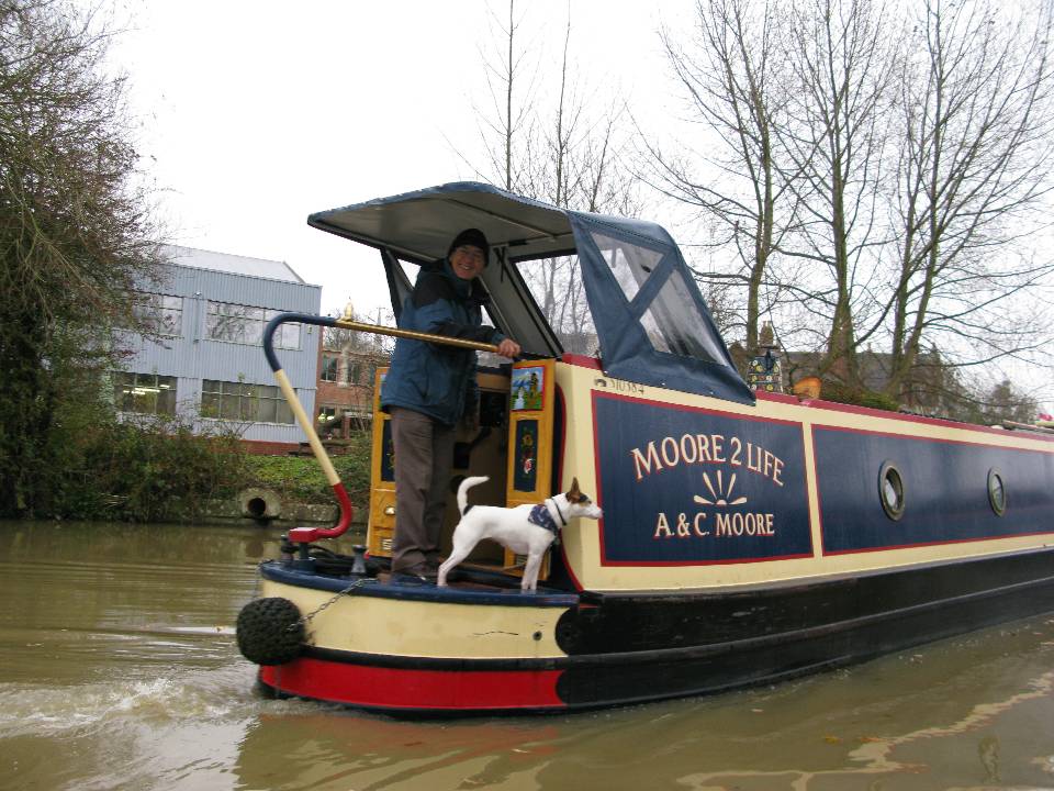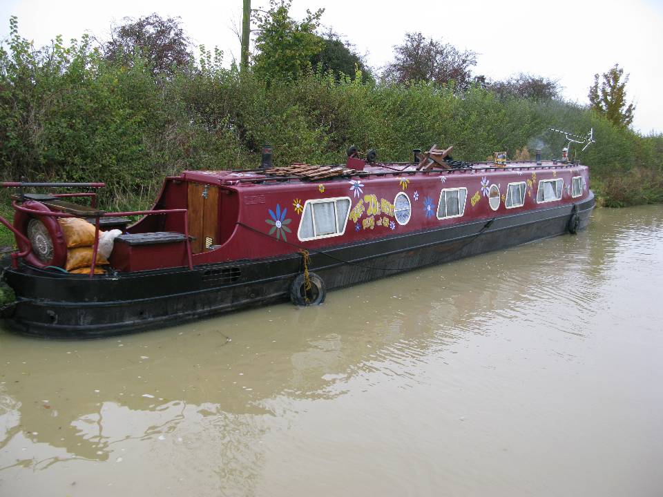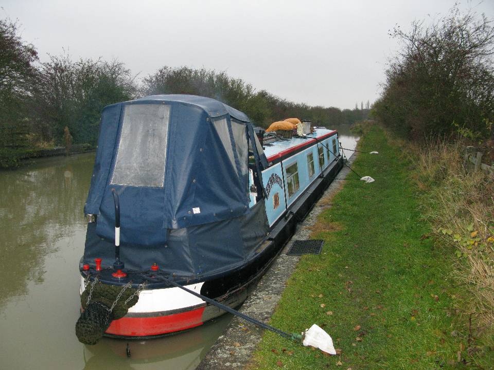 Wednesday 5th November 2008 Location: Calcutt, Warwickshire, Grand Union Canal Today: 5 miles, 3 locks. Total distance: 1851 miles. Total locks: 1261 A day of indecisions due to the weather. The day started off with intermittent heavy drizzle and it was a question of should we/should’nt we move. Shortly after returning from a walk up to the village to pick up the papers, we decided to move the 100 yards to the water point to top up then reverse back into the mooring. By the time we filled the tank, our mooring spot had been taken so that made up our minds for us. We headed off in the direction of Warwick, eventually mooring up not too far from Calcutt bottom lock – a nice peaceful spot so there shouldn’t be any problems with fireworks upsetting the dogs tonight. Chas, Ann and Molly on nb MOORE 2 LIFE passed us by this morning, photo below. They came over for a quick chat but were in a hurry to catch the bus into Daventry. I am sure it will not be too long until our paths cross again. We popped into Calcutt marina to see about being able to leave the boat there over Xmas while we pop down to Cornwall and Wiltshire to visit family. We have pencilled in some dates so at least that is sorted out. Very friendly people in the office at Calcutt. We have been on the lookout for wood as our log pile is getting very low. No luck today though. Current Mooring