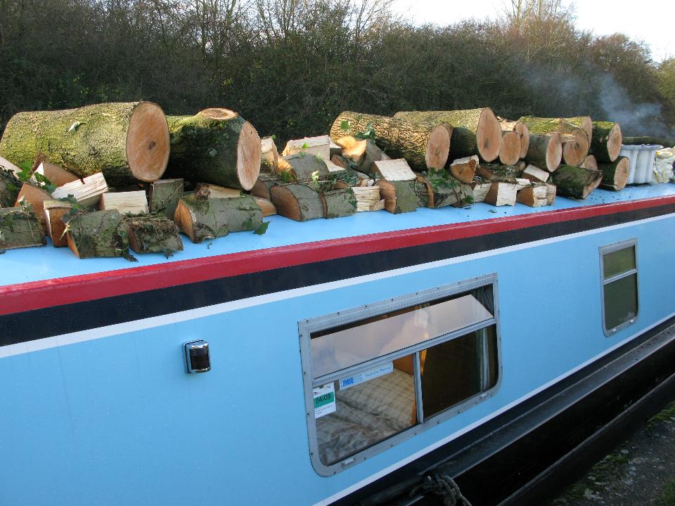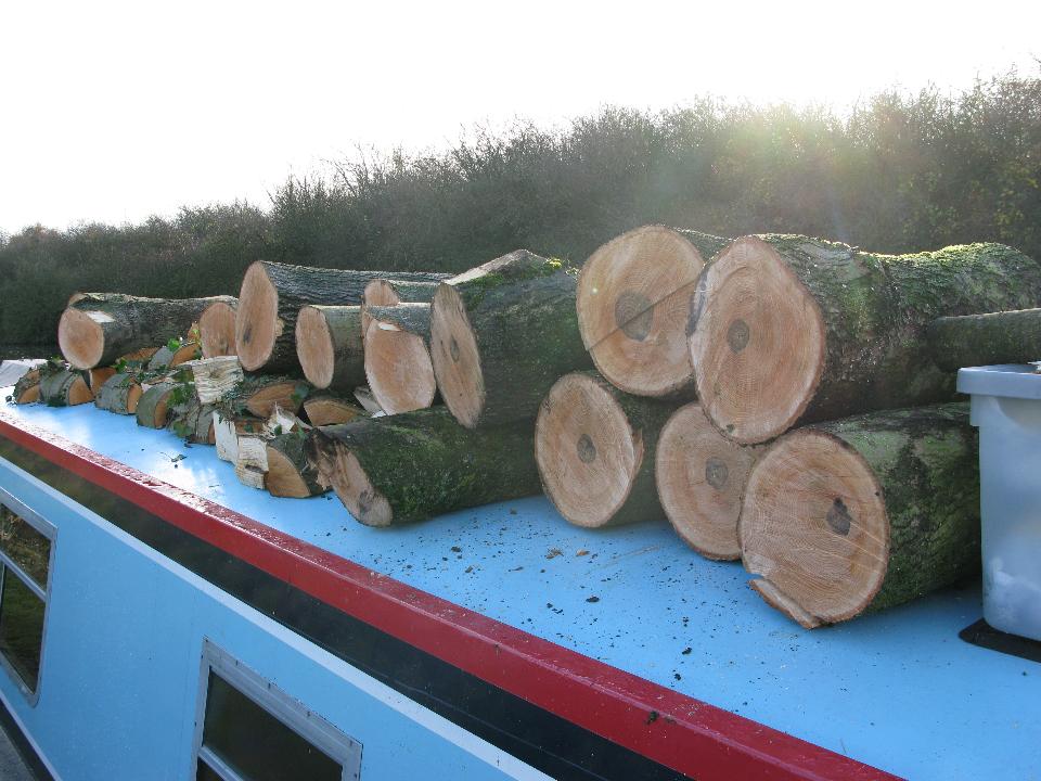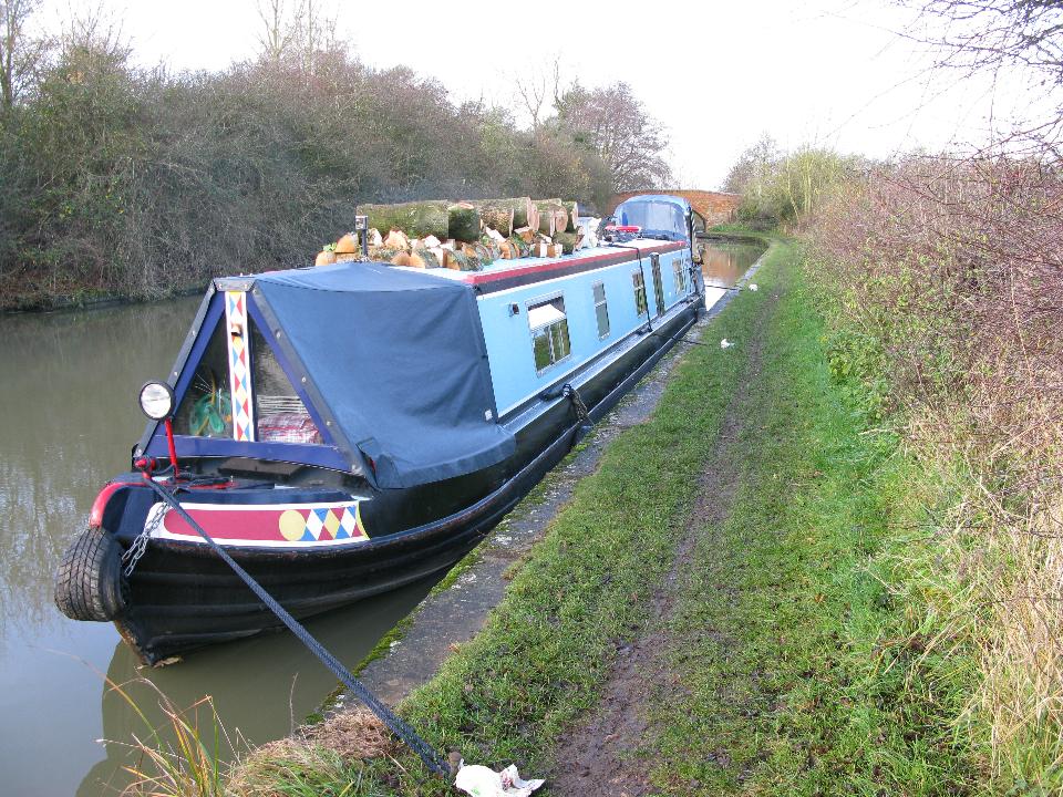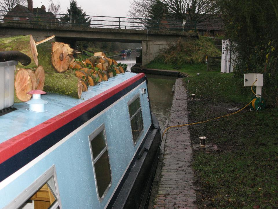 Monday 17th November 2008 Location: Bascote, Warwickshire, Grand Union Canal Today: 2 miles, 5 locks. Total distance: 1870 miles. Total locks: 1286 A miserable day today weather wise, damp and cold. I decided to move on a bit when the weather cleared a touch around lunch time. I had only intended to go up through Radford Bottom Lock so that I could moor up somewhere a little more peaceful as there have been a lot of runners, dog walkers and cyclist passing by. They don’t bother me but they drive the dogs mad. Two miles and five locks later, I moored up in total darkness. I had trouble finding a mooring spot as the canal was very shallow in most places and where it wasn’t shallow; the tow path was too hard to get the pins in. So why was I so late mooring up? Well, I came across a large fallen Ash tree right beside one of the locks. Christmas has come early. I just can’t believe that I didn’t see it last week when I passed by on the way down to Leamington Spa. Someone else had been at it as most of the branches had been removed by a bow saw. Well, I couldn’t just leave it there, even though it was getting dark. Out came the chainsaw and most of the tree is now on the roof. I have left some bits behind for someone else to have as there is little room left on the roof. There is now a lot of weight on the roof now and the boat is a good few inches lower in the water. I was asked the question recently ‘what are these water points that I keep referring to’, I tend to assume that everyone knows what a water point, Elsan station etc. is but of course, if you have never been on a canal, how would you know. Anyway, I took a photo of the Elsan station and water point beside the Fosse Way when I stopped to fill up with water (see below). An Elsan station is like a large toiles specifically designed for emptying toilet cassettes into. Elsan is the name of a company that manufactures toilets etc. This is truly a lovely mooring spot, peaceful and quiet. Click on the link at the top of the page (current location) to see a map of the location. Current Mooring