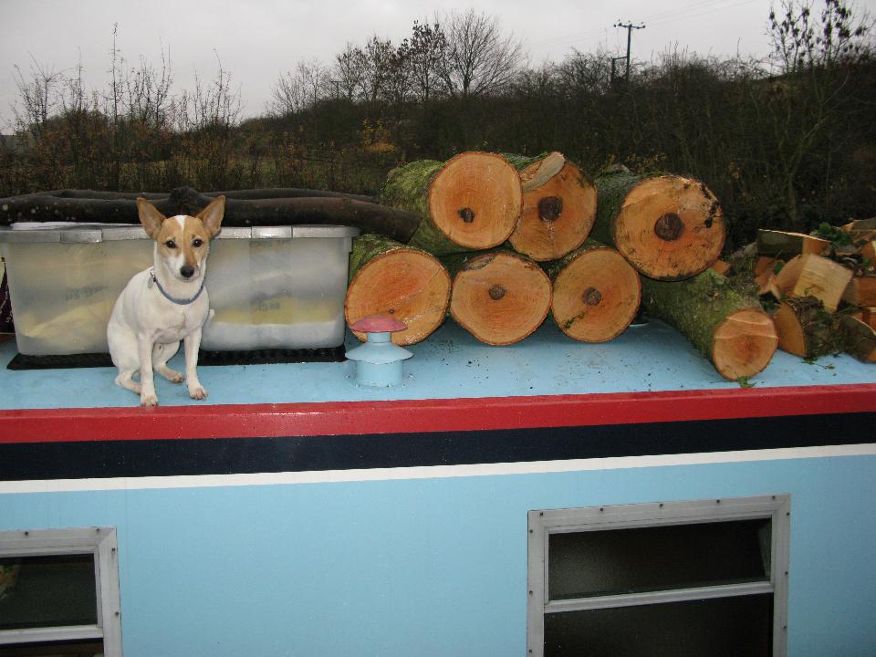 Archie standing guard over the wood for the fire that he loves so much