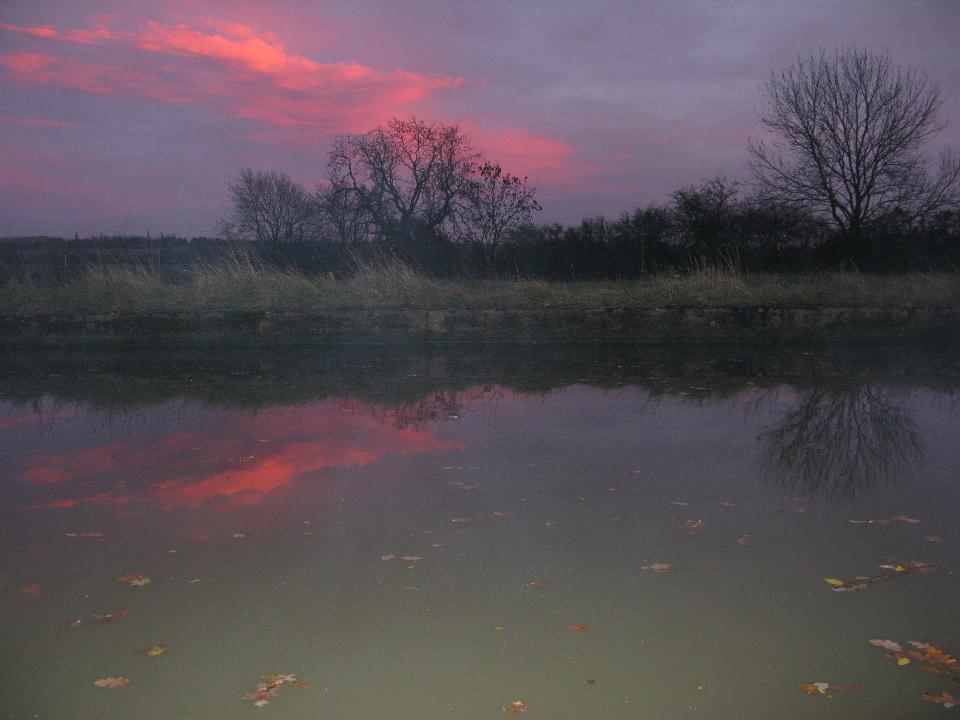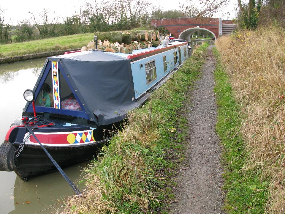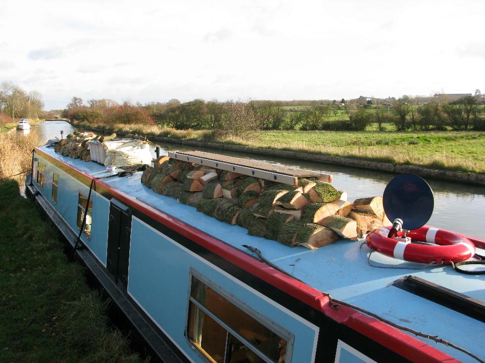 Wednesday 19th November 2008 Location: Long Itchington, Grand Union Canal Today: 2 miles, 5 locks. Total distance: 1872 miles. Total locks: 1291 Up early as it was such a lovely morning and I was wanting to move on to Long Itchington to visit the Co-Op to buy some bread. Pulled the pins just before 08:00 and headed up through the locks. I arrived at Bascote Bottom lock to find the pound almost drained (a pound is the name given to the stretch of water between two locks). Someone had left one of the paddles slightly up and the water had drained out over night. It took the best part of an hour to re-fill the pound by opening the paddles on the three locks above the drained pound. Good exercise first thing in the morning!! I passed nb Joie de Vive (good name) half way through the locks. I have seen Joie de Vive around Braunston quite a few times in the past. The lady owner (she is travelling single handed too) told me she had a winter mooring in Braunston last year so that is why I have seen it around so often. A BW van pulled up just as I was mooring up to shut the gate on the top lock. The lady driver got out and kindly shut the gate for me. I found the slogan on the side of her van very apt after all of my running about to re-fill the pound this morning – it refers to the waterways as ‘an open air gym’, I can certainly vouch for that!! After mooring up, I took the dogs for a two mile round trip walk to the Co-Op in the village to pick up a loaf of bread – I think that will do me for exercise for today….. Friday 21st While chopping up the wood, I was pondering just how much energy has gone into it all. Firstly finding the tree, cutting it into manageable lengths, carrying it to the boat and lifting it up on to the roof, lifting it off the roof again, cutting it into rings, splitting the rings with a big axe, lifting the logs back onto the roof then finally, lifting the logs back off the roof to burn them……Must be a few calories burnt in that lot!! I had to move a lot of the wood to the rear of the boat yesterday morning as with all of the weight being up front, the drain holes for the gas locker were a couple of inches under the water – not good. I have distributed all of the logs so that with a full tank of water (it’s full at the moment), the gas locker drain holes are a few inches above the water line. Current Mooring