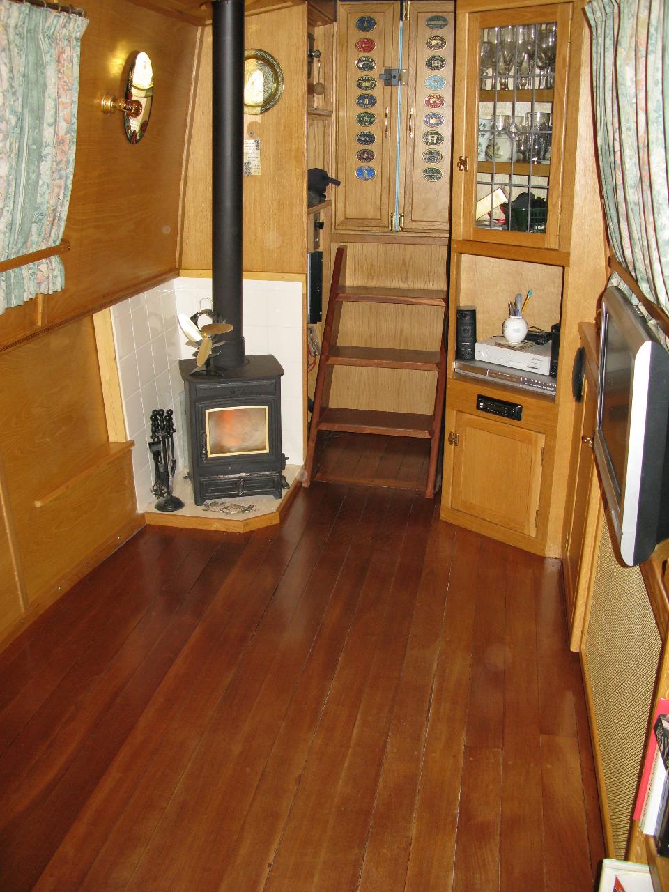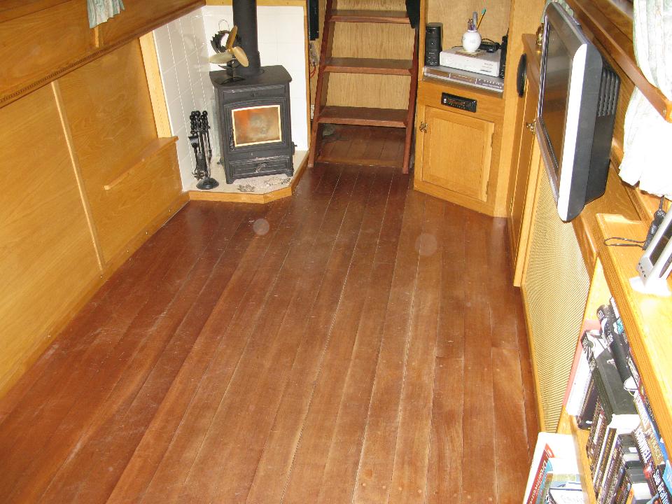 I spied nb Gypsy Rover moored up near Tesco in Rugby on Wednesday. Nobody at home, Dot and Derek were probably off shopping. On reading their blog, it looks as if they are moving to Newbold for Xmas so we will probably get to meet face to face then. nb Gypsy Rover moored at Brownslow - no one at home when I passed by Got up yesterday morning to a fine and mild day so I decided that it would be a good day to varnish the cabin floor – a job I have been putting off for a long time. Sanded the floor down and applied four coats of varnish, one coat every two hours. That should keep it going for another 6 to 9 months. Archie and I had to live in the bedroom all day due to the wet varnish on the floor. Floor before