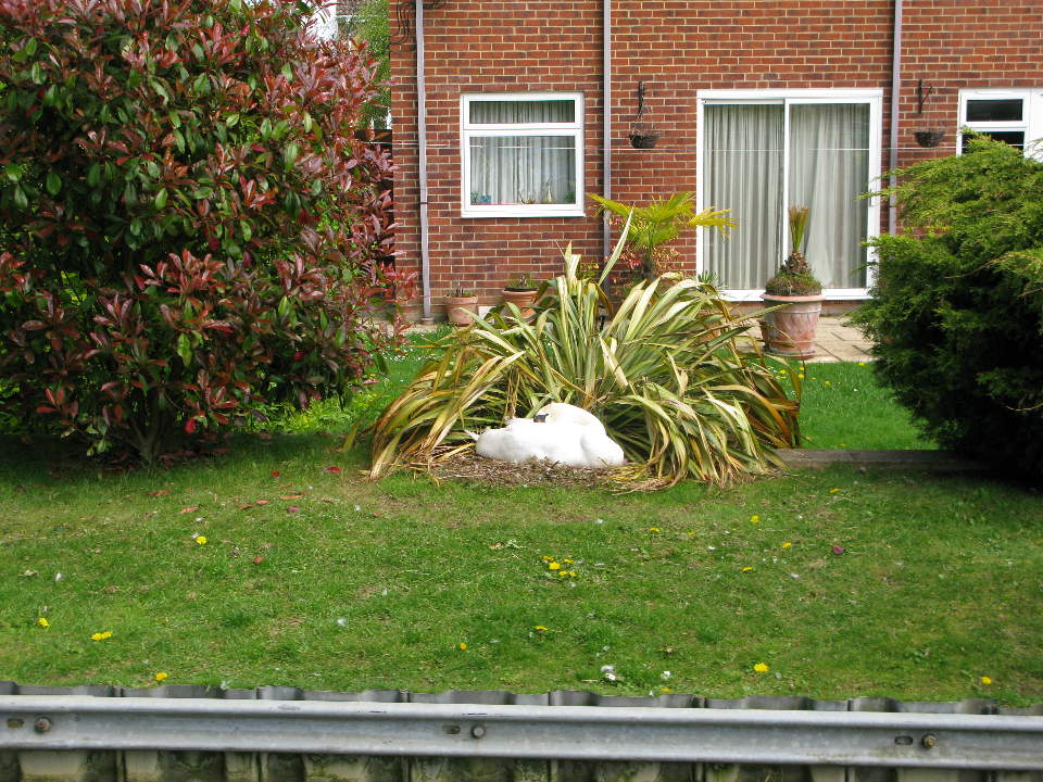 Swan nesting in a garden